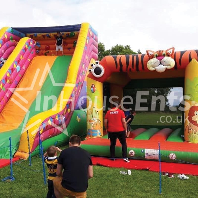 The Jungle Adventure incorporates both a large bouncy castle with a small slide attached to the side. The children enter the slide through a small door which is located inside the bouncing area and make their way up the steps to the top of the slide. They then come out back at the front of the bouncy castle.