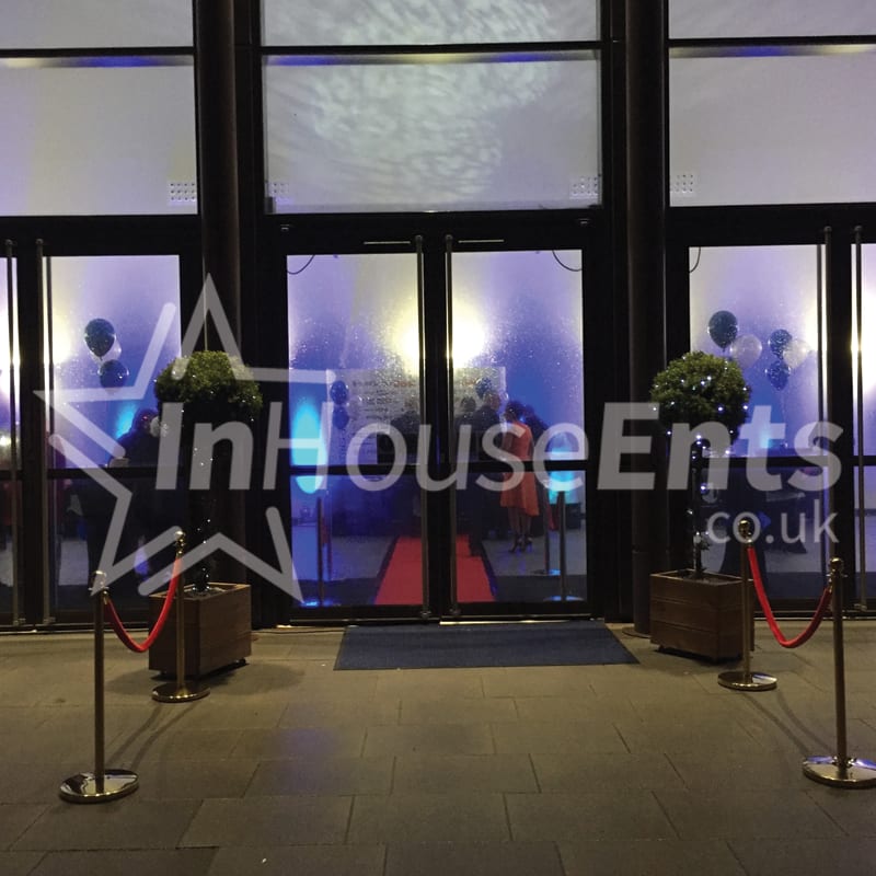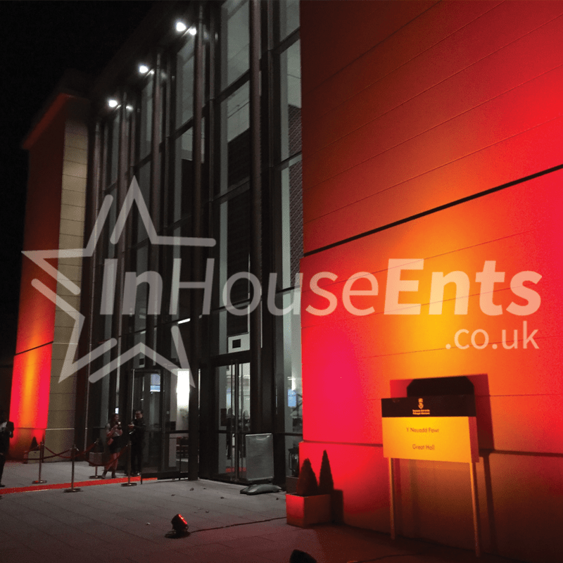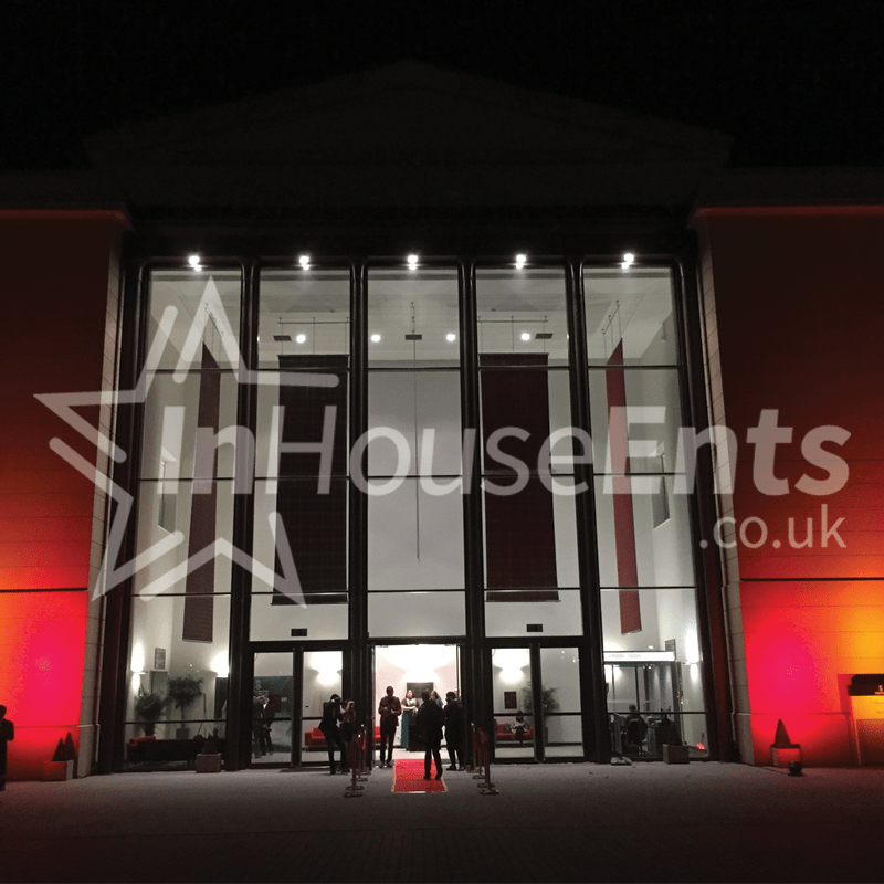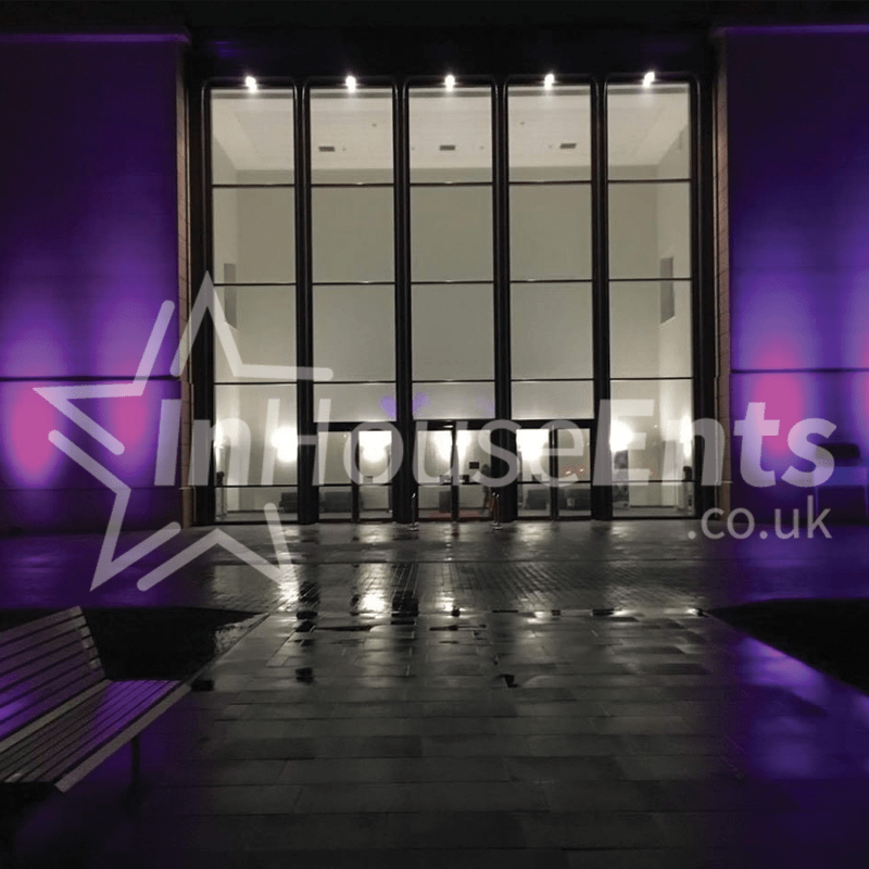 Using the latest in waterproof lighting technology we are able to transform the exterior of almost any venue into a magical spectacle. Have a look at some of the examples in the photos of some previous work. Quite often we are asked to match the brand colours. We've even projected the company logo using custom built outdoor projection lamps.
