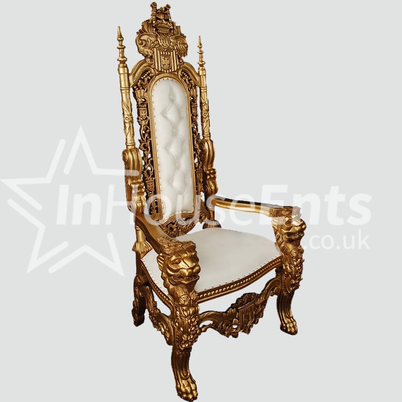 Make your special day even more luxurious with our Wedding Throne Hire service. Our elegant throne chairs are the perfect addition to any wedding venue, adding a touch of grandeur and sophistication to your ceremony, or wedding breakfast. With their guilted gold paint and cream leather seating, these thrones are designed to make the bride and groom feel like royalty.