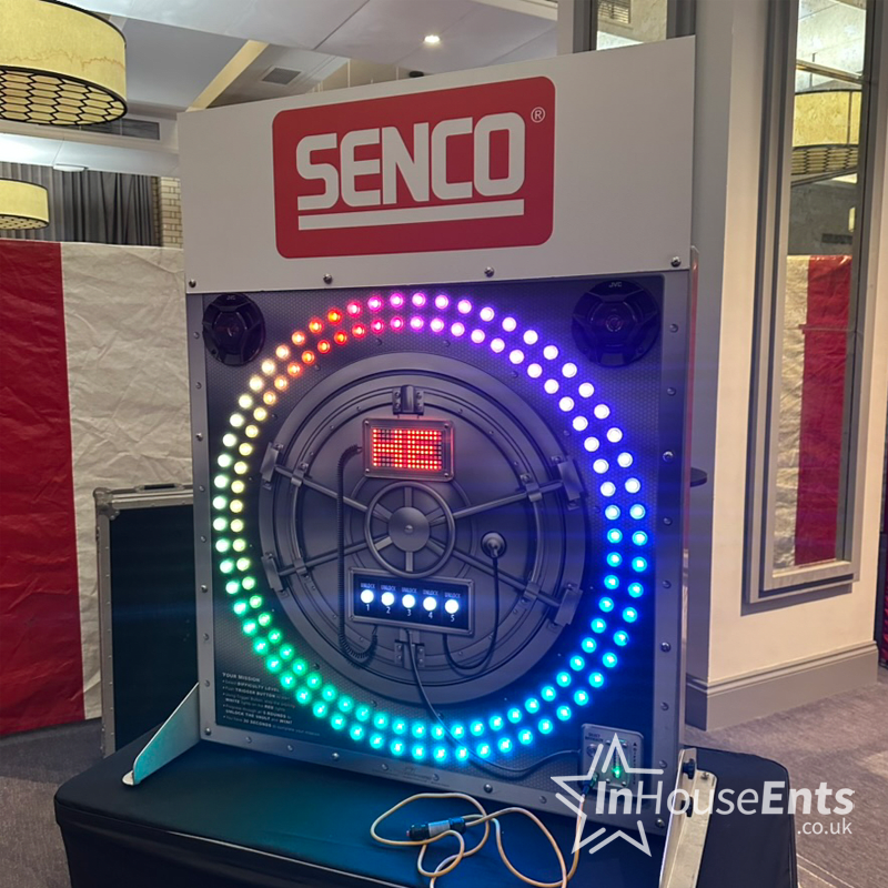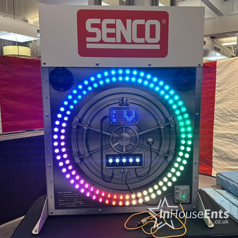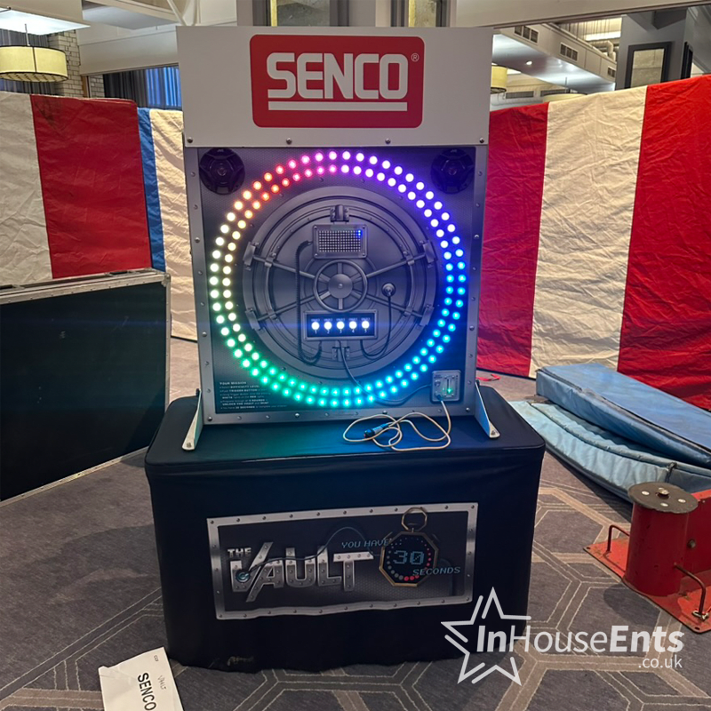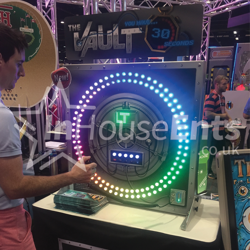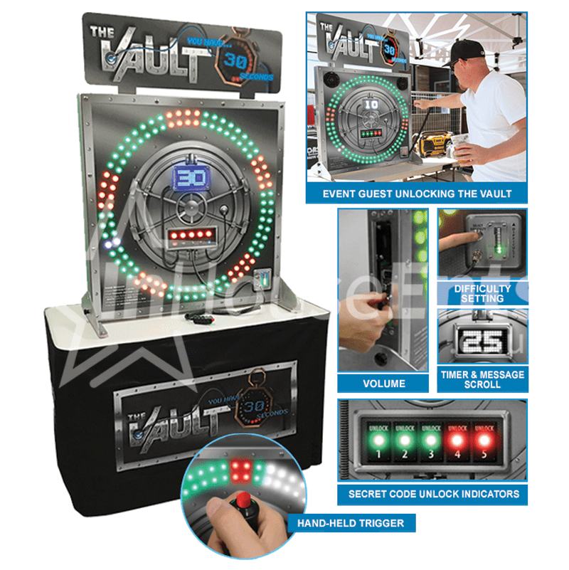 Attempt to unlock The Vault by cracking the “secret code” in just 30 seconds! Using the hand-held trigger, try to stop the orbiting white light in a red “locked” zone. Progress through all 5 digits of the code and you win! Select one of the four difficulty levels. With varying degrees of difficulty, The Vault provides entertainment for a wide range of player abilities.