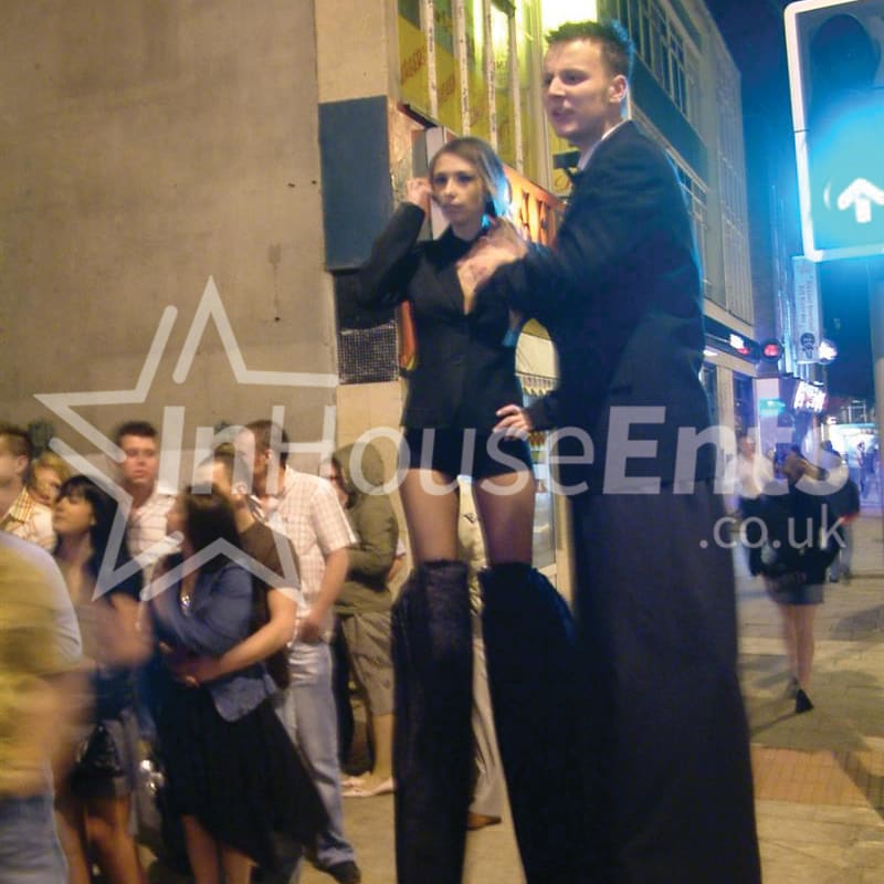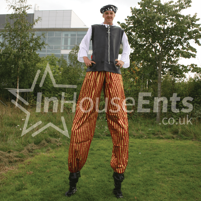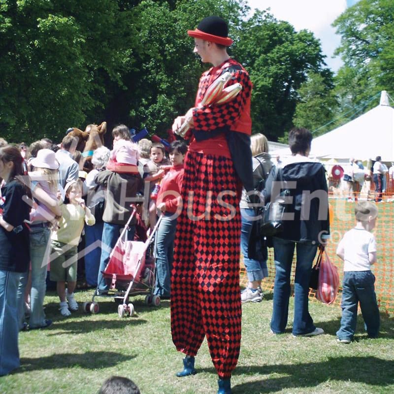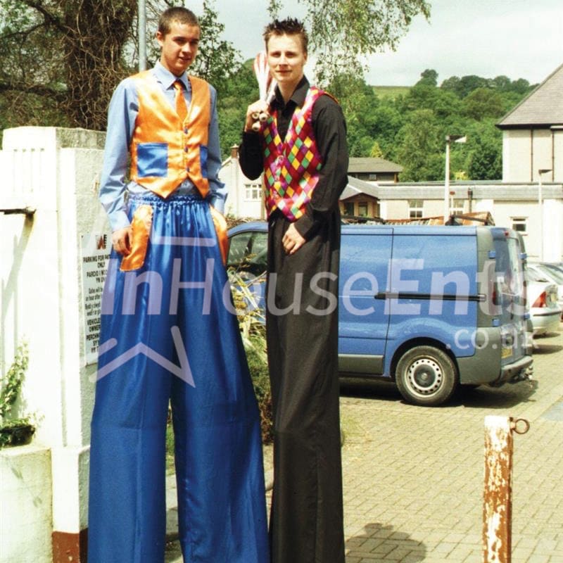 Our standard working height puts our stilt walkers at about 10ft, but the heights can be adjusted according to the venue, and we also perform on bouncy stilts which stand at a height of only about 6ft but are more versatile, allowing the performer to bounce, run, skip and walk over a greater variety of terrain. Younger children especially appreciate the bouncy stilt characters, as they are less intimidating.