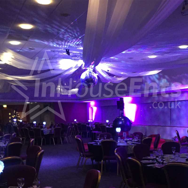 Room Draping can be carried out using a number of materials from lightweight Organza, right through to actual custom built props. All of our equipment that we use comes complete with a Fire Retardancy Certification and copies are supplied once the install is complete.