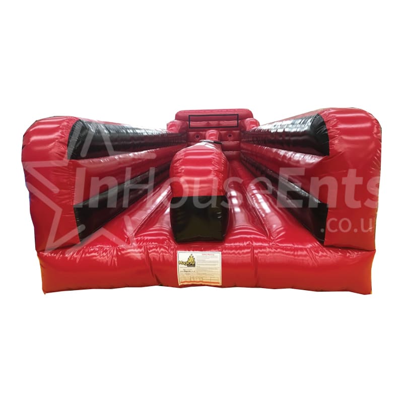 Get the adrenaline of a bungee jump without ever having to leave the ground! This inflatable has two lanes set side by side allowing for a competitive side to the challenge. The competitors are fitted with a safety harness around their waists which is then attached to an elastic bungee cord. They then have to run against the bungee to attempt to place a beanbag the furthest before being pulled back at a high speed.