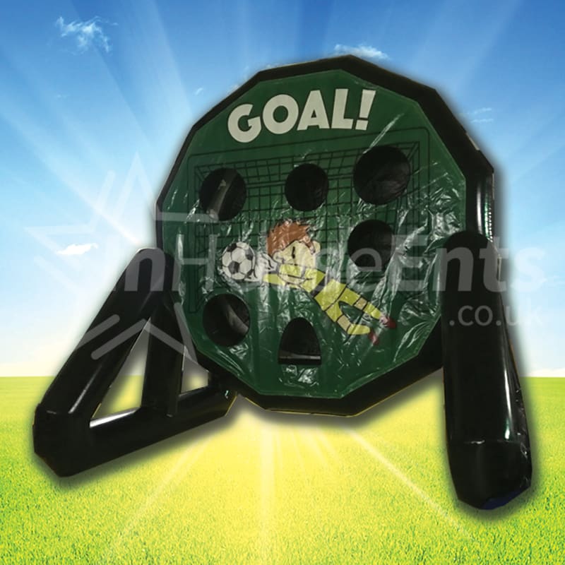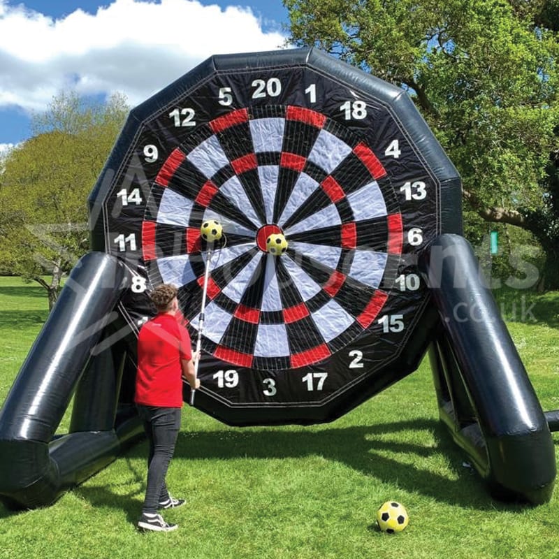 Why not hire our Giant Inflatable Velcro Dartboard. The aim of the game is to kick the velcro balls and score as many points as possible. We supply it with a special pole to retrieve the balls as this inflatable game stands at a whopping 4.6m tall! As an added bonus the inflatable dart board also comes with a Penalty Shoot Out on the other side so you get two games for the price of one!